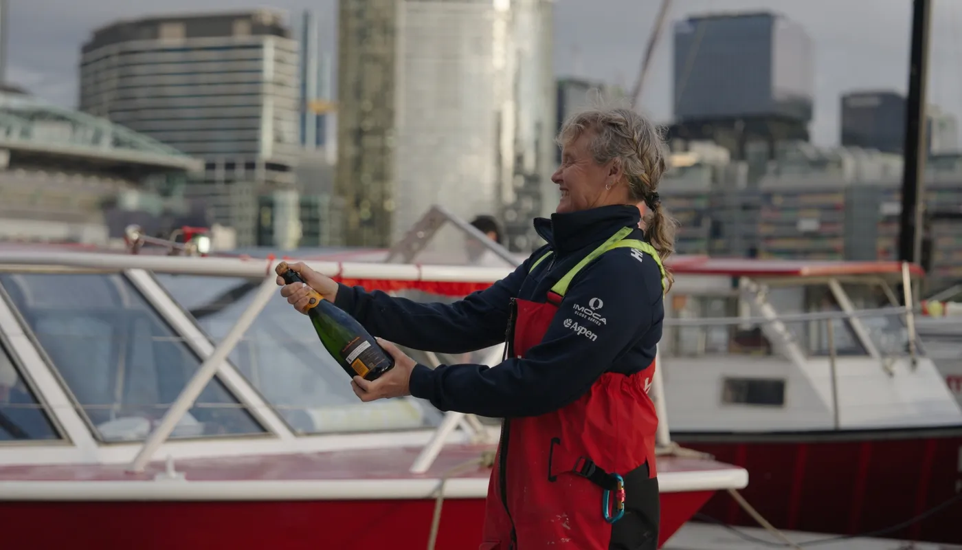 Sourire aux lèvres, comme à son habitude, la navigatrice britannique a été accueillie par un public chaleureux à Melbourne en Australie, 15 jours après son démâtage. Elle a même célébré l’occasion en débouchant une bouteille de champagne sur le ponton !