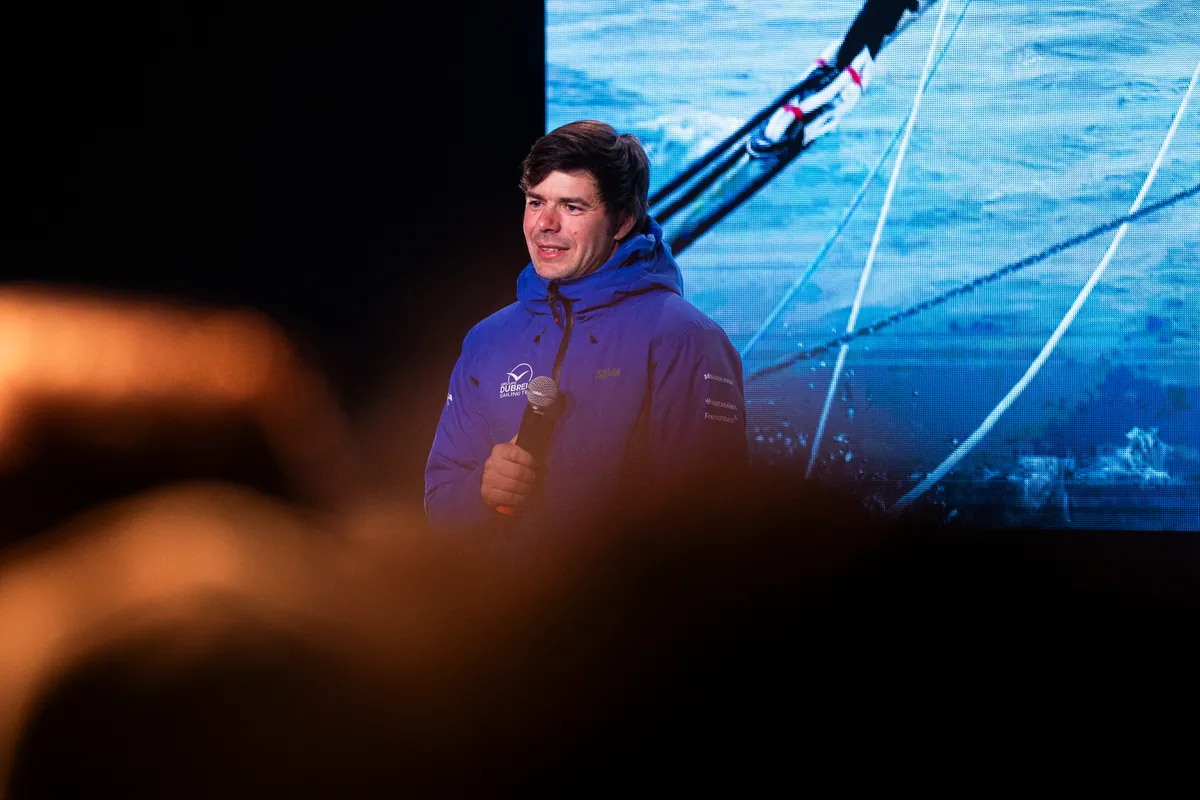 LES SABLES D'OLONNE, FRANCE - 17 JANVIER 2025 : Le skipper de Groupe Dubreuil Sébastien Simon (FRA) est photographié au Skipper Finisher Club du Vendée Globe, le 17 janvier 2025 aux Sables d'Olonne, France - (Photo by Mark Lloyd / Alea)